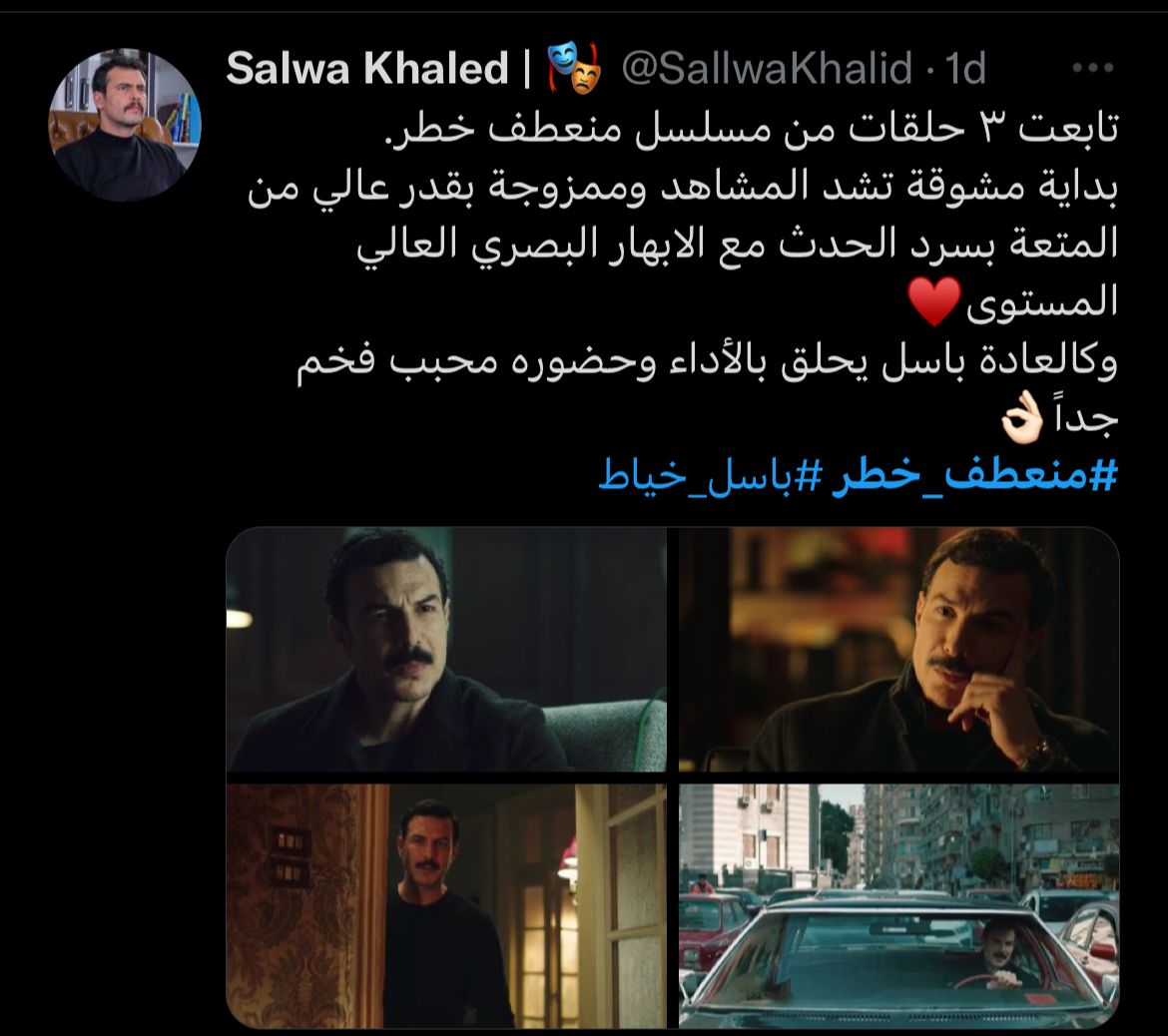 وعلق متابع من متابعي مسلسل منعطف خطر، قائلًا: “بداية مشوقة تشد المشاهد وممزوجة بقدر عالي من المتعة بسرد الحدث مع الإبهار البصري العالي المستوى. وكالعادة باسل يحلق بالآداء”.