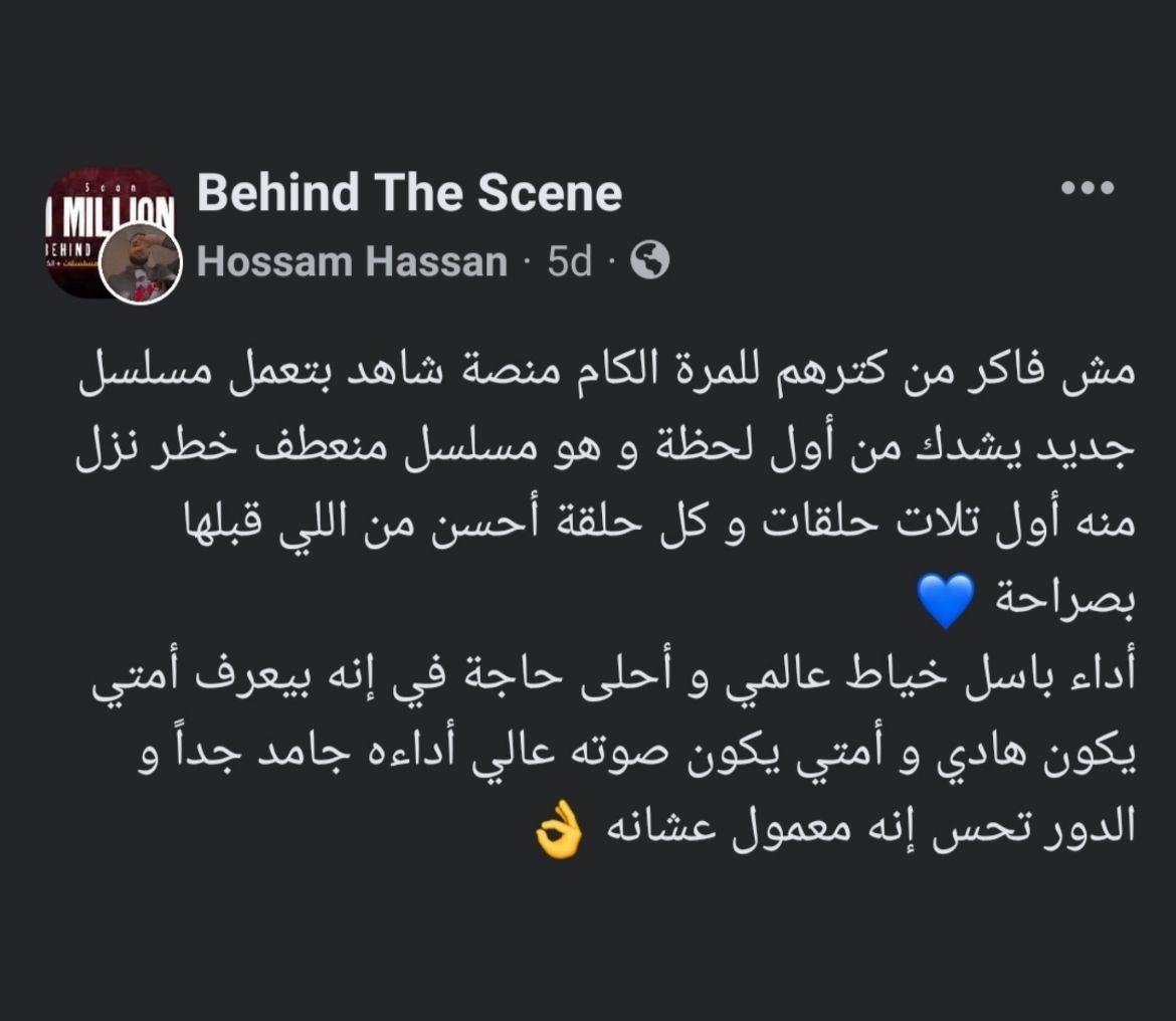 وكتب واحدا من مشاهدي المسلسل: “مسلسل يشدك من أول لحظة.. أداء باسل الخياط عالمي وأحلى حاجة فيه بيعرف إمتى يكون هادي وإمتى يكون صوته عالي.. أدائه جامد جدا والدور معمول عشانه”.