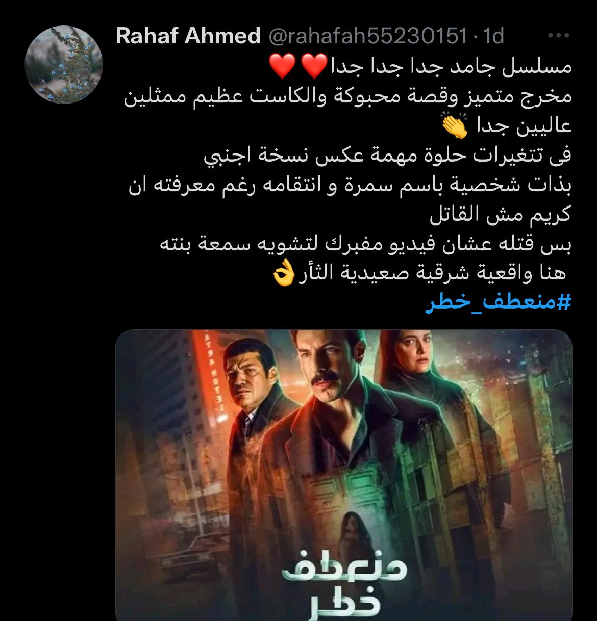 وجاء تعليق آخر: “مسلسل جامد جدا.. مخرج متميز وقصة محبوكة، والكاست عظيم ممثلين عاليين حدا وفي تغييرات حلوة ومهمة عكس نسخة أجنبي بالذات شخصية باسم سمرة وانتقامه رغم معرفته إن كريم مش القاتل”.