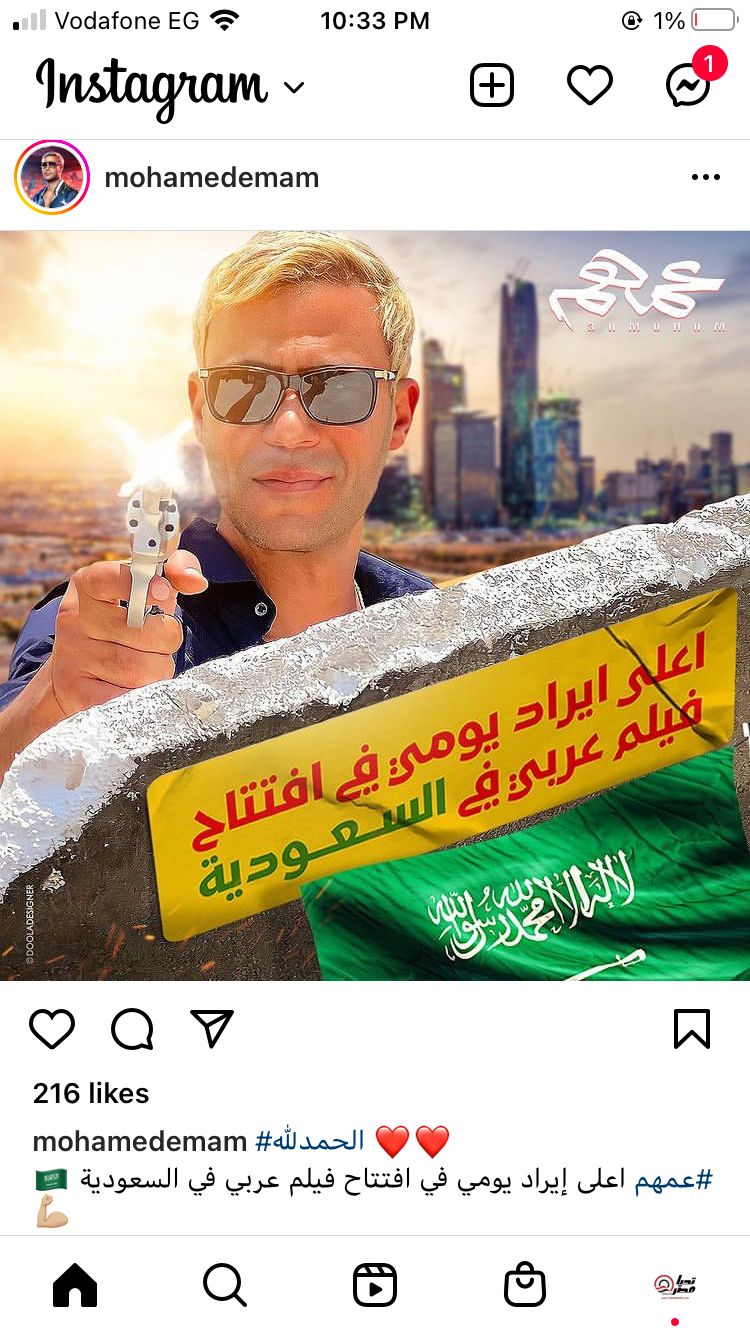 وكتب محمد إمم عبر انستجرام: الحمد لله.. عمهم أعلى إيراد يومي في افتتاح فيلم عربي في السعودية.