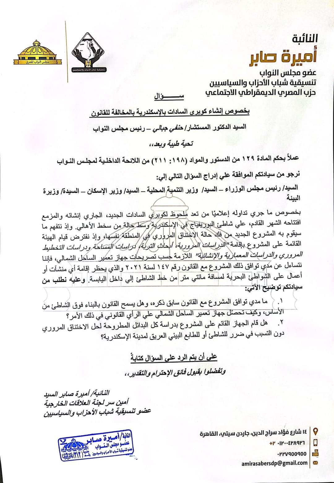تقدمت النائبة أميرة صابر، عضو مجلس النواب عن الحزب المصري الديمقراطي الاجتماعي وتنسيقية شباب الأحزاب والسياسيين، بسـؤال لكل من رئيس مجلس الوزراء الدكتور مصطفى مدبولي، ووزير التنمية المحلية اللواء محمود شعراوي، و وزير الإسكان الدكتور عاصم الجزار، و وزيرة البيئة الدكتورة ياسمين فؤاد، بخصوص إنشاء كوبري السادات بالإسكندرية بالمخالفة للقانون.