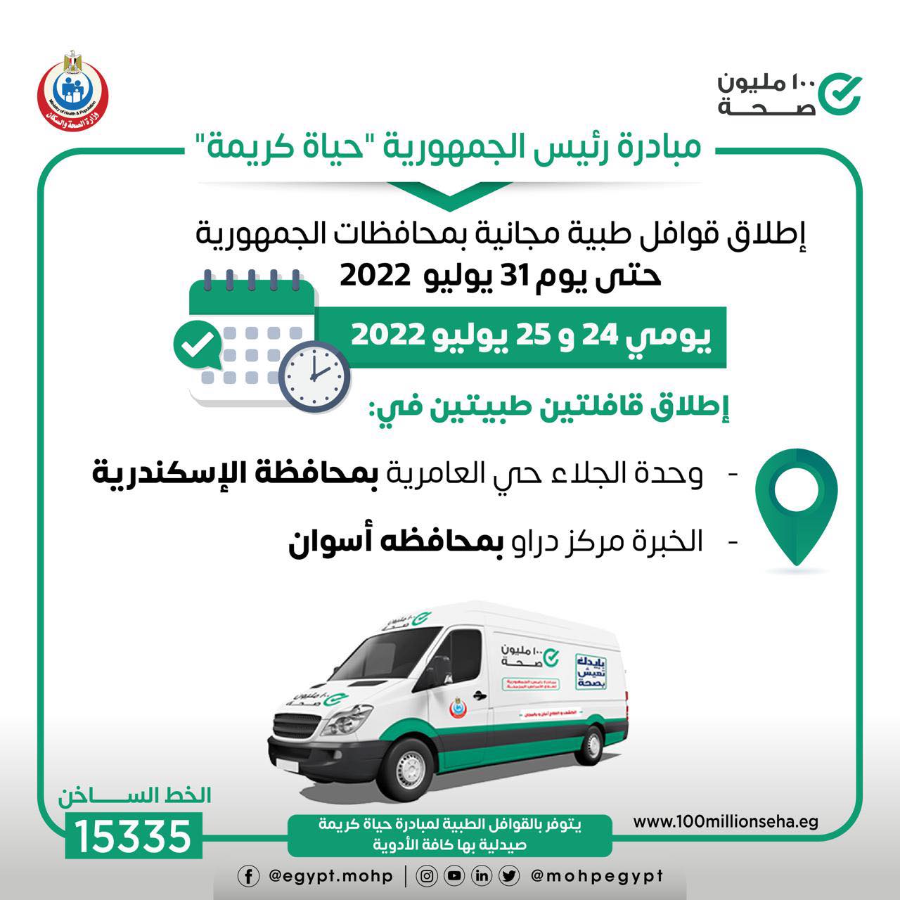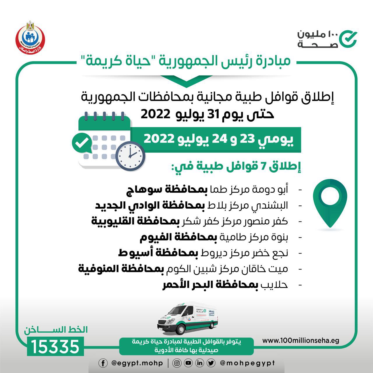 وأوضحت وزارة الصحة والسكان، في منشور لها على صفحتها الرسمية على موقع التواصل الاجتماعي «فيس بوك»، أن القوافل الطبية ستتواجد في 9 محافظات هم: «سوهاج - الوادي الجديد - القليوبية - الفيوم - أسيوط - المنوفية - البحر الأحمر - الإسكندرية - أسوان»، على مدار يومي 24 و25 يوليو؛ لتقديم الخدمات الطبية للمواطنين تحت شعار «100 مليون صحة»، مع أخذ كافة الاحتياطات والاحترازات اللازمة لمواجهة فيروس كورونا.