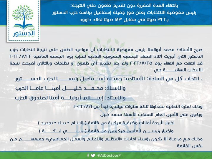 وأضاف أبو العلا: نتيجة الانتخاب النهائيـة أصبحت هي انتخاب كل من جميـلة إسـماعيل رئيسـا لحزب الدسـتور، و محــمـد خـليـل أمينا عاما الحزب، و إســـــــلام أبوليلــــــة أمينا لصندوق الحزب، وذلك لفترة انتخابية مقدارها ثلاثة سنوات تبدأ من 1/8/2022، ويكون على الأمين العام المنتخب الأستاذ محمد خليل