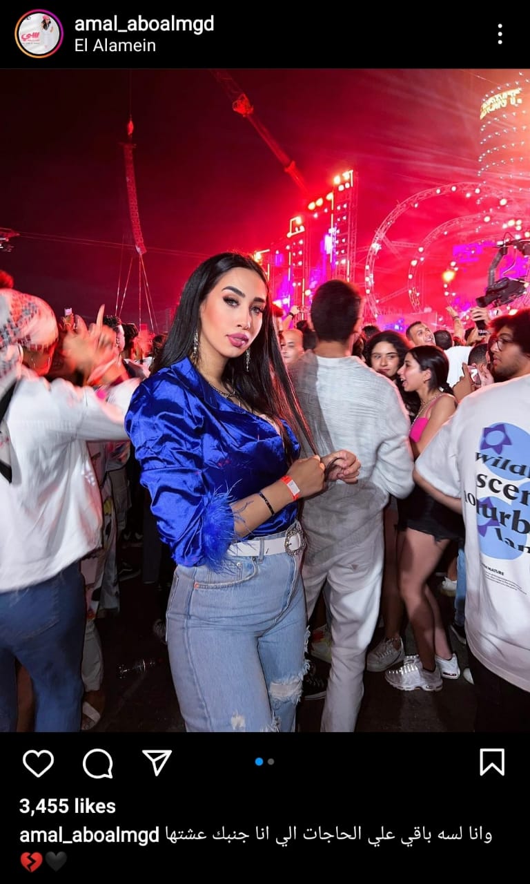 حيث نشرت آمال أبو المجد صورًا لها عبر حسابها الشخصي على موقع تبادل الصور والفيديوهات "إنستجرام" من حفل الفنان تامر حسني الذي أقيم منذ عدة أيام بمدينة العلمين الجديدة احتفالًا بإطلاق ألبومه الجديد "عشأنجي"، وعلقت عليها قائلة: "وأنا لسه باقي على الحاجات اللي أنا جنبك عشتها".
