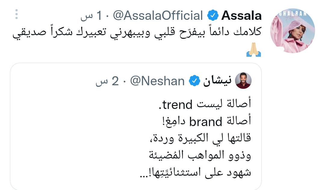 حيث نشر نيشان تغريدة عبر حسابه الشخصي على موقع التواصل الاجتماعي "تويتر" كتب فيها: "أصالة ليست تريند، أصالة براند دامغ، قالتها لي الكبيرة وردة، وذوو المواهب المضيئة شهود على استثنائيتها، مبروك".