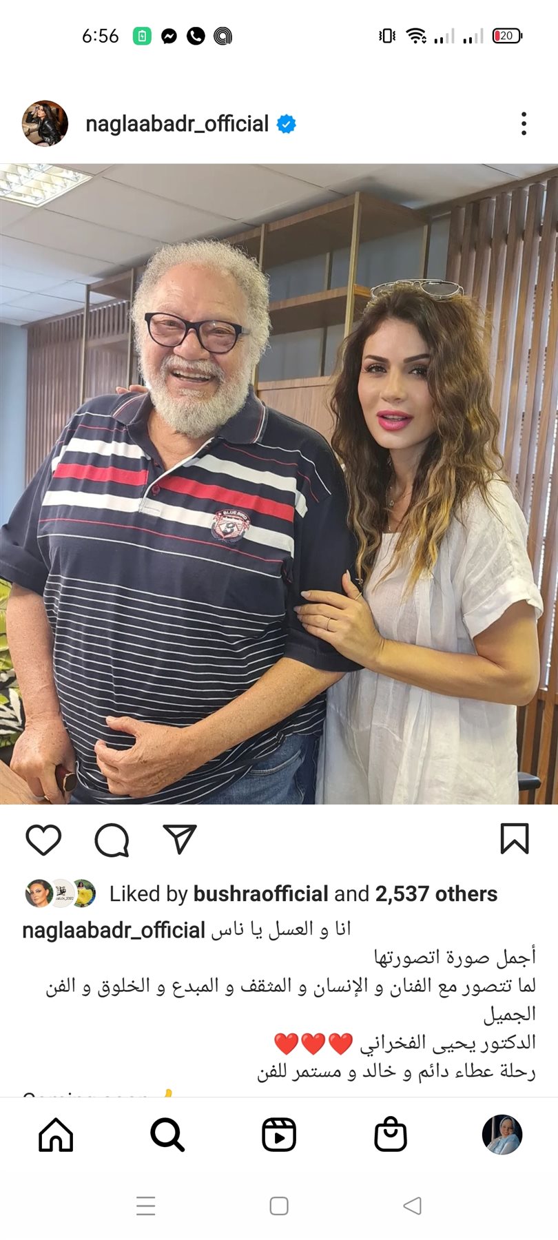 نشرت نجلاء بدر صورة تجمعها بالفنان يحيي الفخراني عبر حسابها الرسمي بموقع تبادل الصور والفيديوهات القصيرة «إنستجرام»، وعلقت عليها قائلة: "انا والعسل يا ناس، أجمل صورة اتصورتها لما تتصور مع الفنان والإنسان والمثقف والمبدع و الخلوق و الفن الجميل، الدكتور يحيى الفخراني رحلة عطاء دائم و خالد و مستمر للفن".
