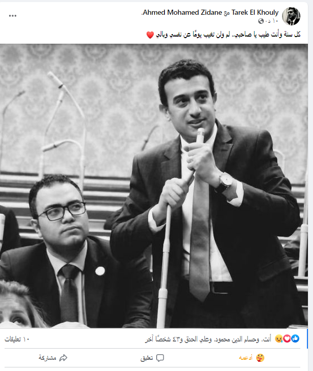 حيث قال النائب أحمد فتحي، وكيل لجنة التضامن الاجتماعي والأشخاص ذوي الإعاقة، “ اليوم ذكرى ميلاد أخي وصديقي الغالي النائب أحمد زيدان رحمه الله عليه في جنة الخلد يا حبيبي واحشتني يا صاحبي”.