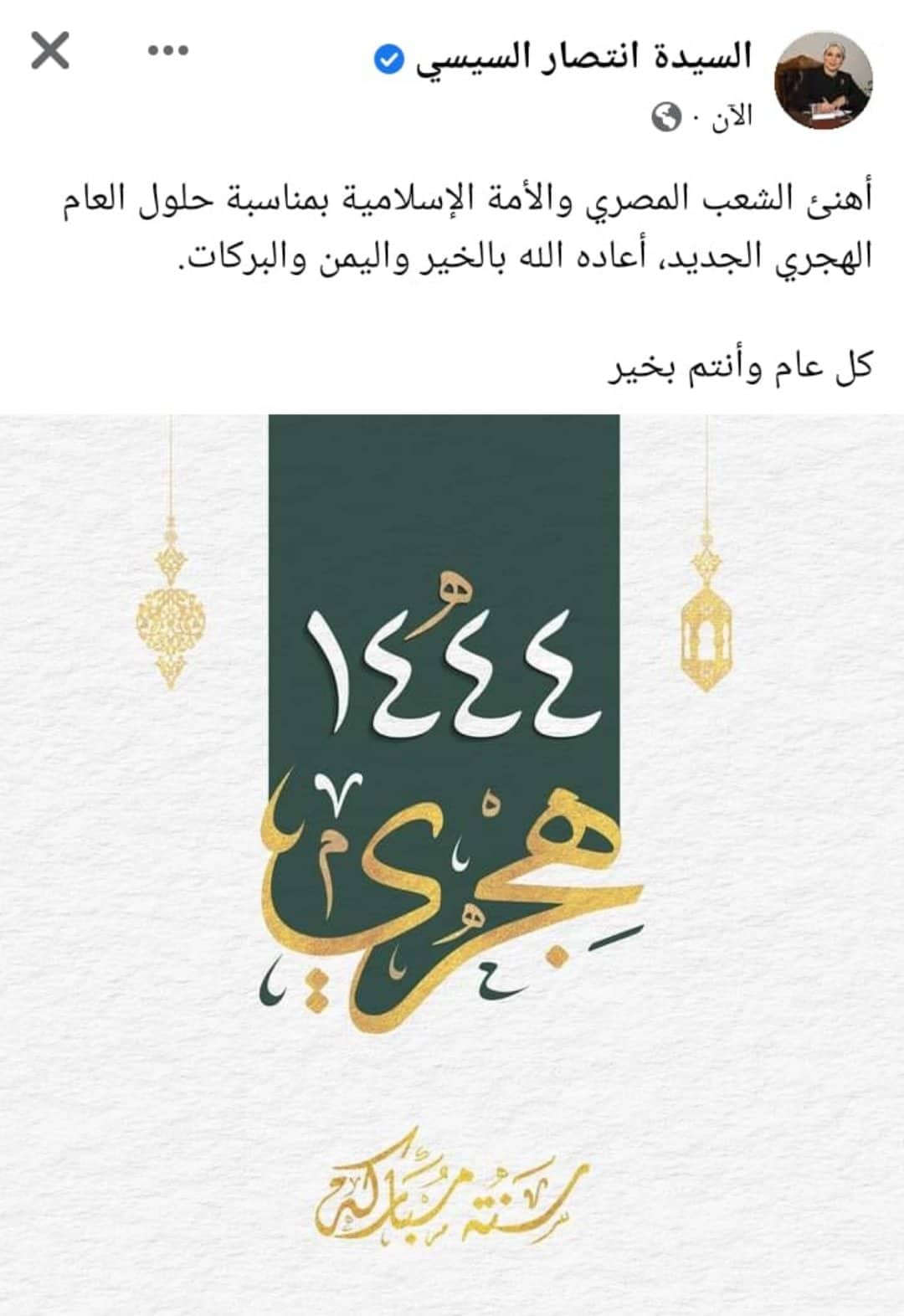وأضافت قرينة الرئيس على حسابها الرسمي على موقع التواصلا الاجتماعي فيسبوك، “ أهنئ الشعب المصري والأمة الإسلامية بمناسبة حلول العام الهجري الجديد، أعاده الله بالخير واليمن والبركات”.