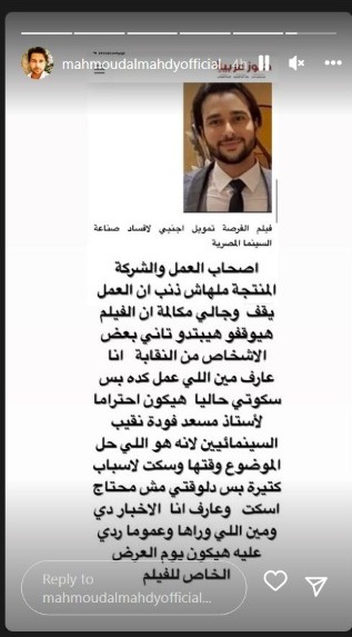 وشارك محمود المهدي خبر إحدي الصحف التي تتهمه بالتمويل الأجنبي، وذلك عبر حسابه الرسمي بموقع تبادل الصور والفيديوهات الشهير انستجرام وعلق: اصحاب العمل والشركة المنتجة ملهاش ذنب ان العمل يقف، وجالي مكالمة ان الفيلم هيوقفو هيبدأو تاني، بعض الأشخاص من النقابة.
