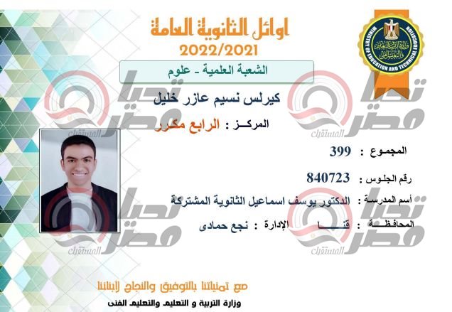 12- كيرس نسيم عازر خليل، من محافظة قنا، مدرسة الدكتور يوسف إسماعيل الثانوية المشتركة، في المركز الرابع مكرر بمجموع 399.