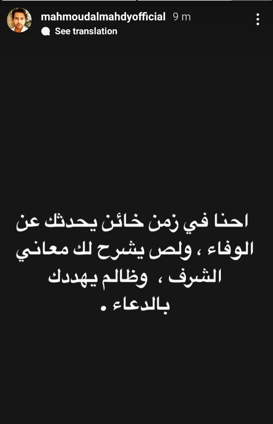 كتب محمود المهدي عبر خاصية الستوري التابعة لصفحته الرسمية بموقع التواصل الاجتماعي لتبادل الصور والفيديوهات انستجرام: "إحنا في زمن خائن يحدثك عن الوفاء".