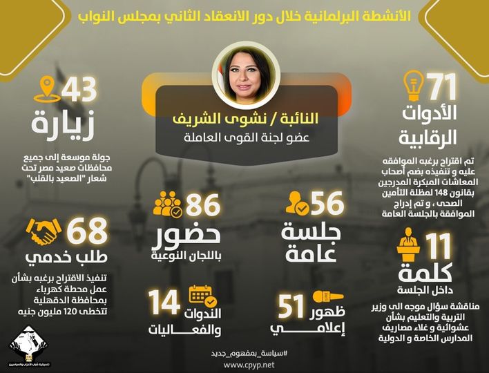 شهد دور الانعقاد الثاني من الفصل التشريعي الثاني لمجلس النواب برئاسة المستشار الدكتور حنفي جبالي، نشاطا واسعا للنائبة نشوى الشريف، عضو لجنة القوى العاملة بمجلس النواب عن تنسيقية شباب الأحزاب والسياسيين، حيث حضرت النائبة 56 جلسة عامة، و86 حضور باللجان النوعية، وعدد 14 من الندوات والفعاليات، وكان للنائبة 51 ظهور إعلامي.