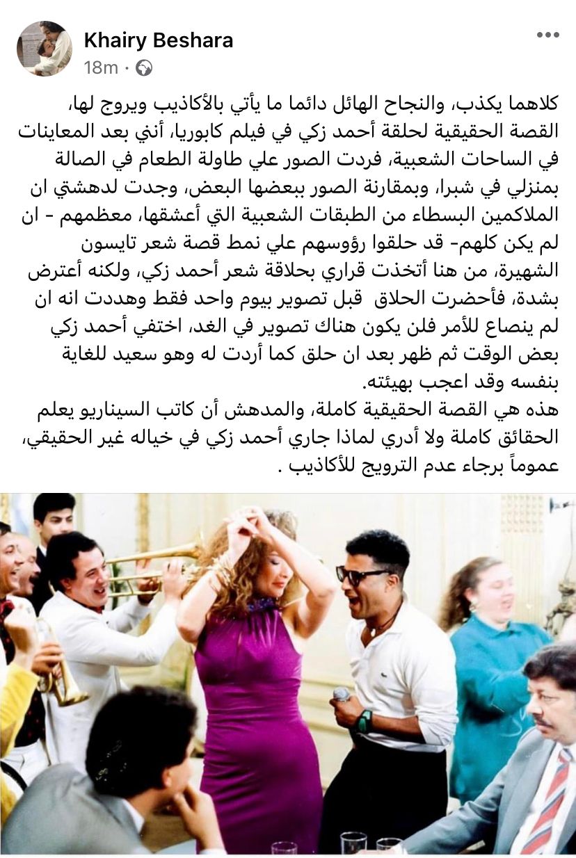 واختتم المخرج كلامه قائلًا: “والمدهش أن كاتب السيناريو يعلم الحقائق كاملة ولا أدري لماذا جارى أحمد زكي في خياله غير الحقيقي.. عمومًا برجاء عدم الترويج للأكاذيب”.