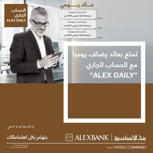 نشر بنك الاسكندرية عبر صفحته الرسمية على موقع التواصل الاجتماعي فيسبوك مزايا الحساب الجاري ALEX DAIL الذى يتيحه البنك بعائد يصل إلى 9%، وبدورية صرف يومياً، وبحد أدنى لفتح الحساب 1000 جنيه.