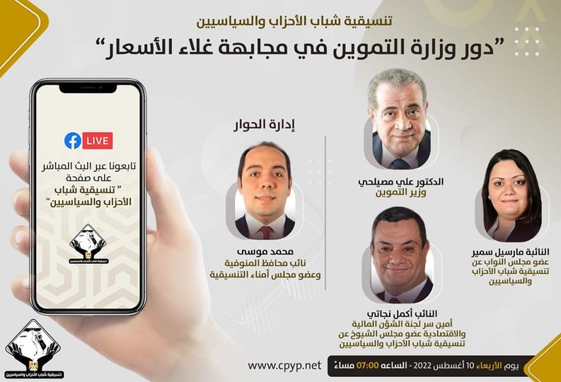 تنظم تنسيقية شباب الأحزاب والسياسيين، صالون سياسي تحت عنوان "ما هو دور وزارة التموين في مجابهة غلاء الأسعار؟"، بحضور الدكتور علي المصيلحي، وزير التموين والتجارة الداخلية.