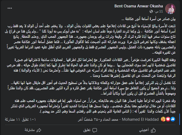 وجاء البيان كالتالي: بيان صادر من أسرة أسامة أنور عكاشة... تابعت الأسرة ببالغ الإستياء ما أذيع من لقاءات إعلامية على بعض القنوات بشأن الوالد ، ولا يخفى على أحد أن الوالد لا يعد فقط رب أسرة أسامة أنور عكاشة، بل وكما تتردد العبارة دوماً على لسان احبائه: “ده مش أبوكم بس ده أبونا كلنا”… ولم يكن هذا من فراغ بل نتاج سنوات سخر فيها أبانا فكره لترك أثر وقيمة وتراث يرقى بوجدان جمهوره... هذا الجمهور المحب الذي وحتى اللحظة يتابع اعماله بشغف وكانها تعرض لاول مرة ويردد عباراته التي أصبحت كما الأقوال المأثورة... فكما عشق أسامة انور عكاشة مصر والمصريين بادله جمهوره ذات العشق... وليس الجمهور المصري فقط بل والجمهور العربي الذي أطلق عليه عميد الدراما العربية تعبيراً عن تقديره لقيمته.
