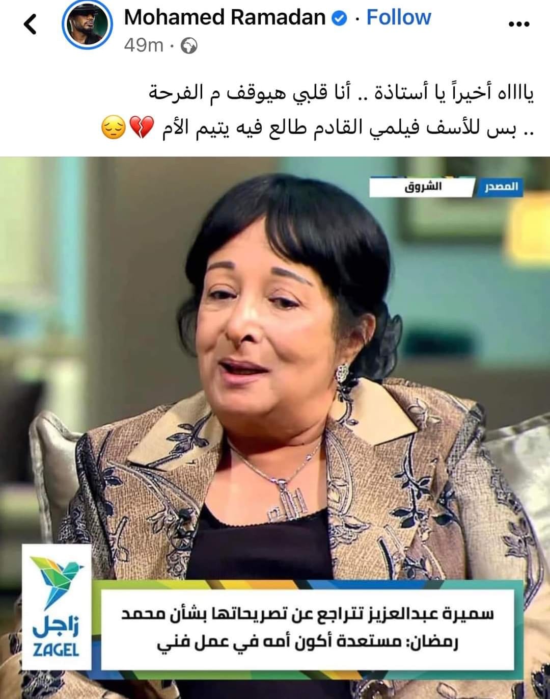 شهدت مواقع التواصل الإجتماعى حالة من الغضب الواسع تجاه ما إعتبره البعض إساءة الفنان محمد رمضان لنائبة مجلس الشيوخ، الفنانة سميرة عبد العزيز،وذلك عبر الصفحة الرسمية له، بإعادة نشره تصريح للفنانة سميرة عبد العزيز وتحدثها فيه بأنه تراجعت عن تصريحاتها السابقة بشأن عدم قبوله بأن تكون أم له فى أى عمل فنى، ليكون تعقيب الفنان محمد رمضان بقوله:" ياااه يا استاذه..أخيرا ولكن أنا الفليم القادم يتيم الأم"، وهو الأمر الذى إعتبره رواد مواقع التواصل الإجتماعى إساءة لفنانة قديرة وأيضا لنائبة وممثلة عن الشعب المصرى فى أحد مؤسسات الدولة وهى مجلس الشيوخ.