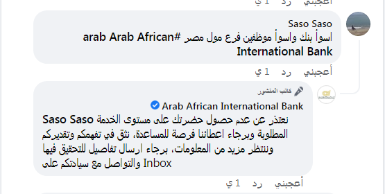 قالت عميلة البنك العربى الافريقى في تعليق على صفحة المصرف الرسمية عبر موقع "فيسبوك"، : "أسوأ بنك وأسوأ موظفين فرع مول مصر".