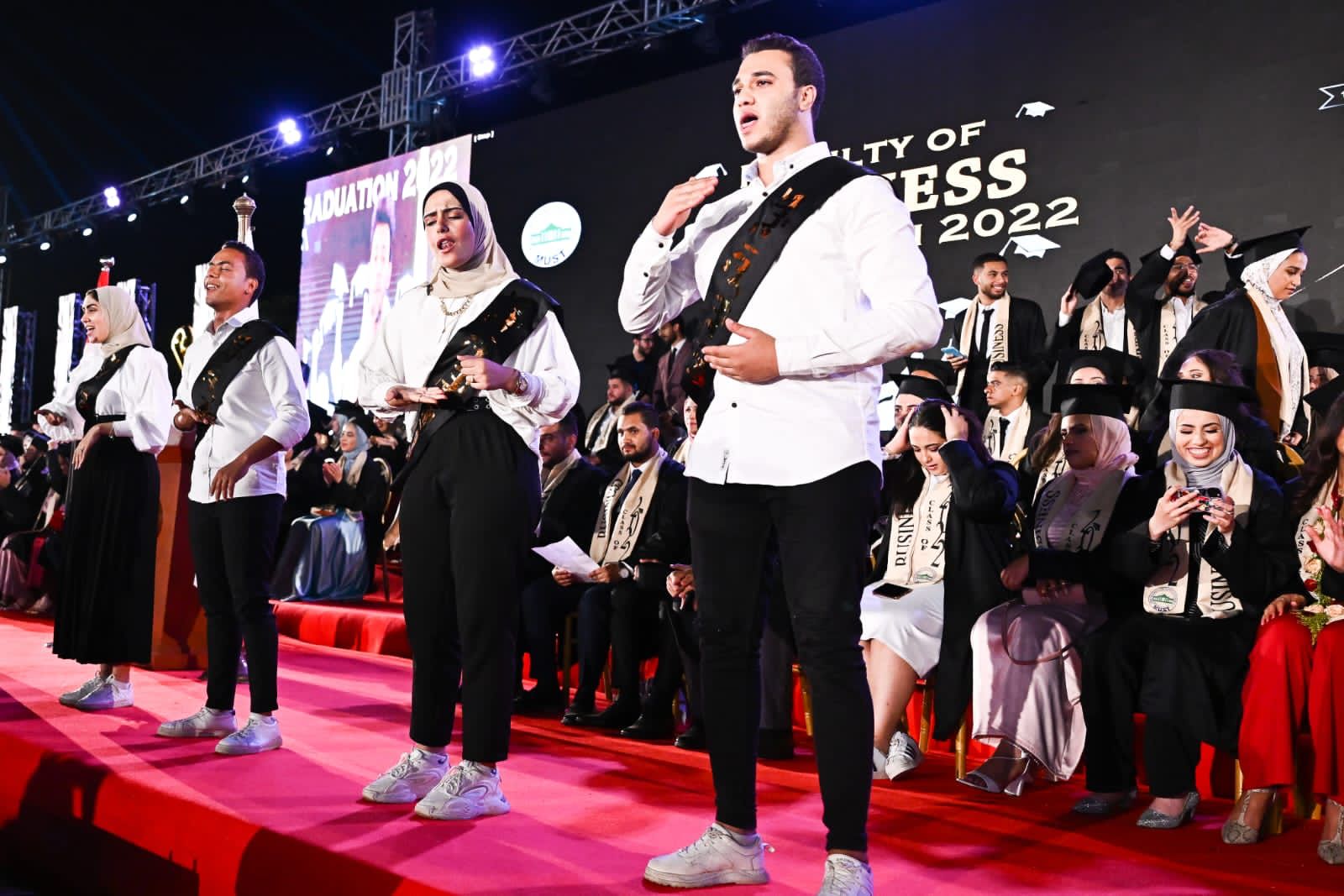 ورحب د. شريف رفعت بالحضور وضيوف الحفل موجها لهم الشكر على مشاركة الطلاب فرحتهم بعد الانتهاء من مشوارهم التعليمي والاستعداد لخوض تجارب الحياة العملية متسلحين بالعلم والانطلاق للساحة التجارية متسلحين بأحدث الأساليب العملية الحديثة والبرامج الحديثة في مجال إدارة الأعمال"، وقدم د. رفعت الشكر والتحية لكل القائمين على الحفل وعلى رأسهم الكاتب والإعلامي محمد فودة عضو مجلس الأمناء ومستشار الجامعة، كما وجه الشكر للجنة المنظمة لحفلات التخرج، ولأعضاء هيئة التدريس الذين كانوا بمثابة أولياء أمور لجميع الطلاب خلال فترة دراستهم، قائلا: "نقدم التحية على ما قدمتموه من دعم لطلابكم طوال مسيرتهم التعليمة، كما قدم التهنئة لاولياء الأمور مؤكدا على أن الفرحة اليوم تخص أولياء الأمور أكثر من الخريجين لانهم أصحاب هذا الحفل الحقيقيين، ولا يمكن ان يتم تغافل دور الأب الحامي لأبنائه والأم المدرسة التي تنشئ النبت الصالح للمجتمع فلهم جميعا كل التحية والتقدير".