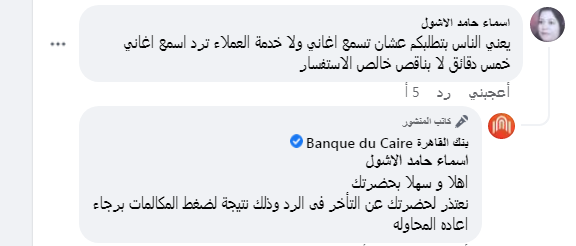قالت عميلة بنك القاهرة في تعليق على صفحة المصرف الرسمية،: "يعني الناس بتطلبكم عشان تسمع اغاني ولا خدمة العملاء ترد اسمع أغاني خمس دقائق لا بناقص خالص الاستفسار".