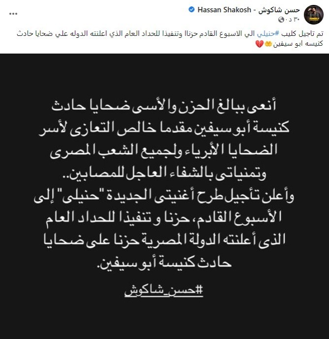 وكتب حسن شاكوش عبر حسابه الرسمي بموقع التواصل الإجتماعي، فيسبوك: “تم تأجيل كليب حنيلي، إلى الأسبوع القادم حزنًا وتنفيذًا للحداد العام الذي اعلنته الدولة على ضحايا حادث كنيسة أبو سيفين”.