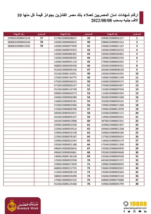 أعلن بنك مصر، أرقام شهادات عملاء بنك مصر الفائزين بجوائز قيمة كل منها 10 آلاف جنيه بسحب 8 اغسطس 2022م لـ شهادات أمان المصريين.