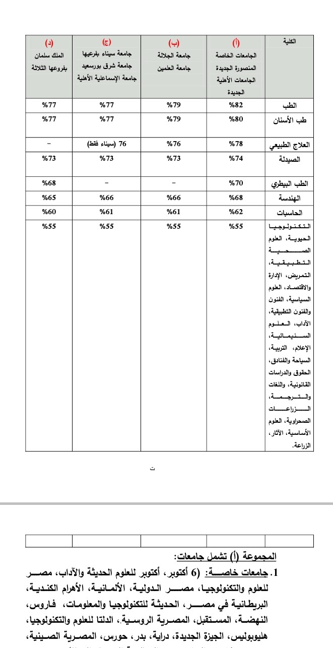 وجاء الحد الأدنى للقبول الذي يسمح للطالب بالتقدم للالتحاق بكافة التخصصات بكليات الجامعات الخاصة والأهلية، على النحو التالي: