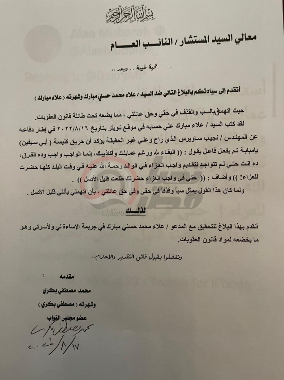 وتابع بكري فى بلاغه المقدم ضد علاء مبارك،" حيث اتهمه بالسب والقذف في حقي وحق عائلتي ، مما يضعه تحت طائلة قانون العقوبات، مضيفا إنه “كتب السيد/ علاء مبارك علي حسابه في موقع تويتر بتاريخ ٢٠٢٢/٨/١٦ في إطار دفاعه عن المهندس / نجيب ساويرس الذي راح وعلي غير الحقيقة يؤكد أن حريق كنيسة ( أبي سيفين) بإمبابـة تـم يفعل فاعل يقول : (( البقاء لله ورغم عمايلك وأكاذيبك، إنما الواجب واجب وده الفرق، ده انت حتـي لـم تتواجـد لتقديم واجب العزاء في الوالد رحمة الله عليه في وقت البلد كلهـا حضرت للعزاء! ..حتي في واجب العزاء حضرتك طلعت قليل الأصل".