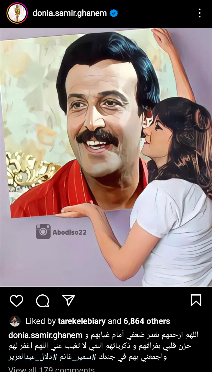 شاركت دنيا سمير غانم عبر حسابها الرسمي بموقع تبادل الصور والفيديوهات انستجرام، صورة للنجوم الراحلين، وعلقت عليها، قائلة: «اللهم ارحمهم بقدر ضعفي أمام غيابهم، وحزن قلبي بفراقهم، وذكرياتهم التي لا تغيب عني، اللهم اغفر لهم واجمعني بهم في جنتك».