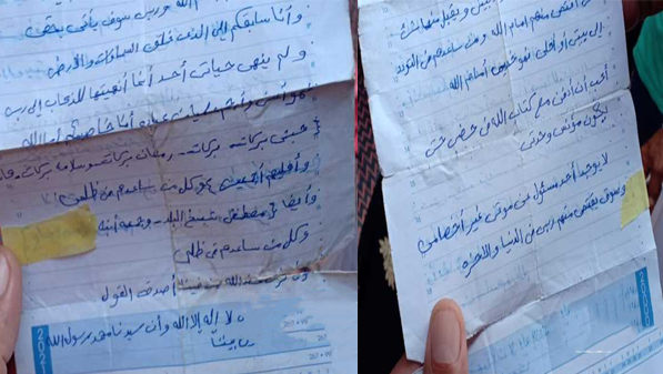 وكتب الشاب في وصيته: أنا العبد لله الذي ظلمته الناس أجمعين من أهل وأصدقاء واكلو حقي، واشتكيهم إلى الله، وأنا خصيمكم أمام الله، وربي سوف يأتي بحقي، وأنا سابقكم إلى الله الذي خلق السموات والأرض، لم ينه حياتي أحد، إنما أنهيتها للذهاب إلى ربي، فهو أرحم».