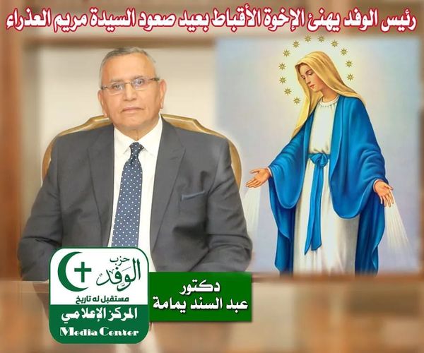 قدم الدكتور عبدالسند يمامة رئيس الوفد، التهنئة إلي الإخوة الأقباط وقداسة البابا تواضروس الثاني بمناسبة عيد صعود السيدة مريم البتول.
