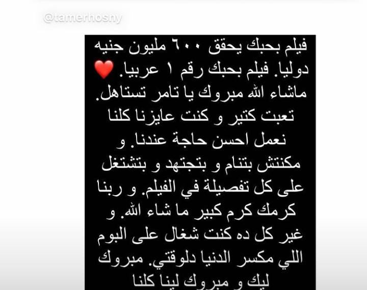 كتبت هنا الزاهد عبر حسابها الرسمي بموقع تبادل الصور والفيديوهات انستجرام: “فيلم بحبك يحقق 600 مليون جنيه دوليا، فيلم بحبك رقم 1 عربيا، ما شاءاللع مبروك ياتامر تستهال”.