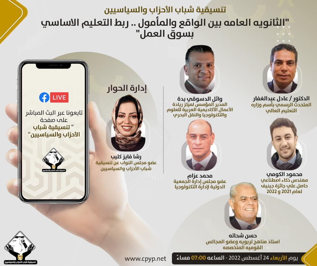 ينظم صالون تنسيقية شباب الأحزاب والسياسيين جلسة نقاشية، في تمام السابعة مساء الأربعاء، بعنوان «الثانوية العامة بين الواقع والمأمول.. ربط التعليم الأساسي بسوق العمل».