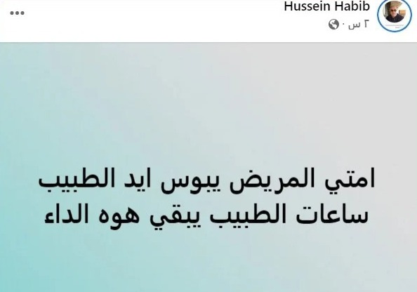 وقال حسين حبيب عبر فيسبوك: “امتي المريض يبوس ايد الطبيب .. ساعات الطبيب يبقي هوه الداء”.