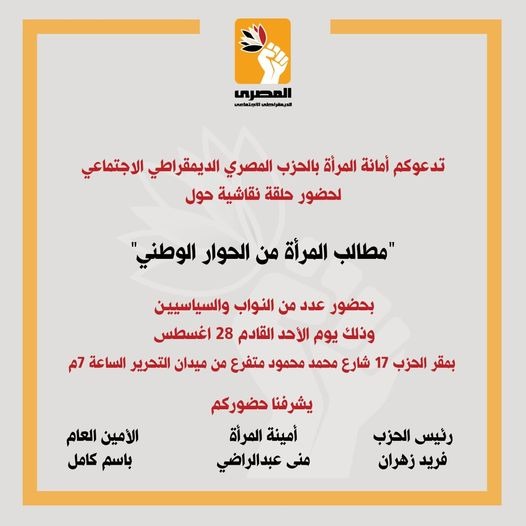 تعقد أمانة المرأة بالحزب المصري الديمقراطي الاجتماعي، حلقة نقاشية حول متطلبات المرأة من الحوار الوطني، بعنوان "المرأة والحوار الوطني".