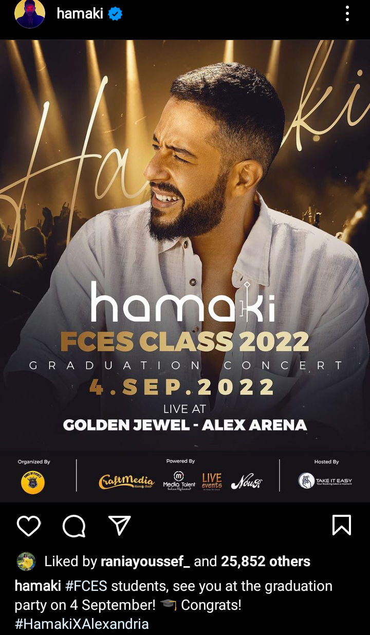 ويحيي محمد حماقي حفله في الإسكندرية في يوم 4 من شهر سبتمبر المقبل، وروج حماقي للحفل من خلال حسابه الرسمي بموقع التواصل الاجتماعي فيسبوك، إذ نشر البوستر للحفل، وعلق عليها قائلا: «انتظركم في حفلة تخرج».