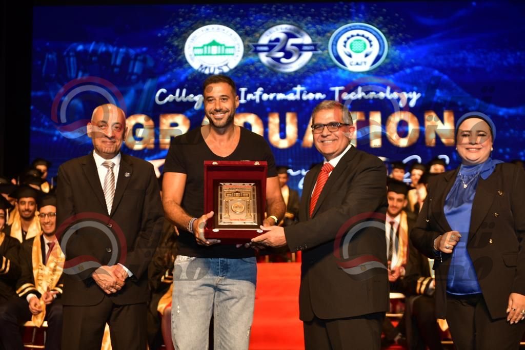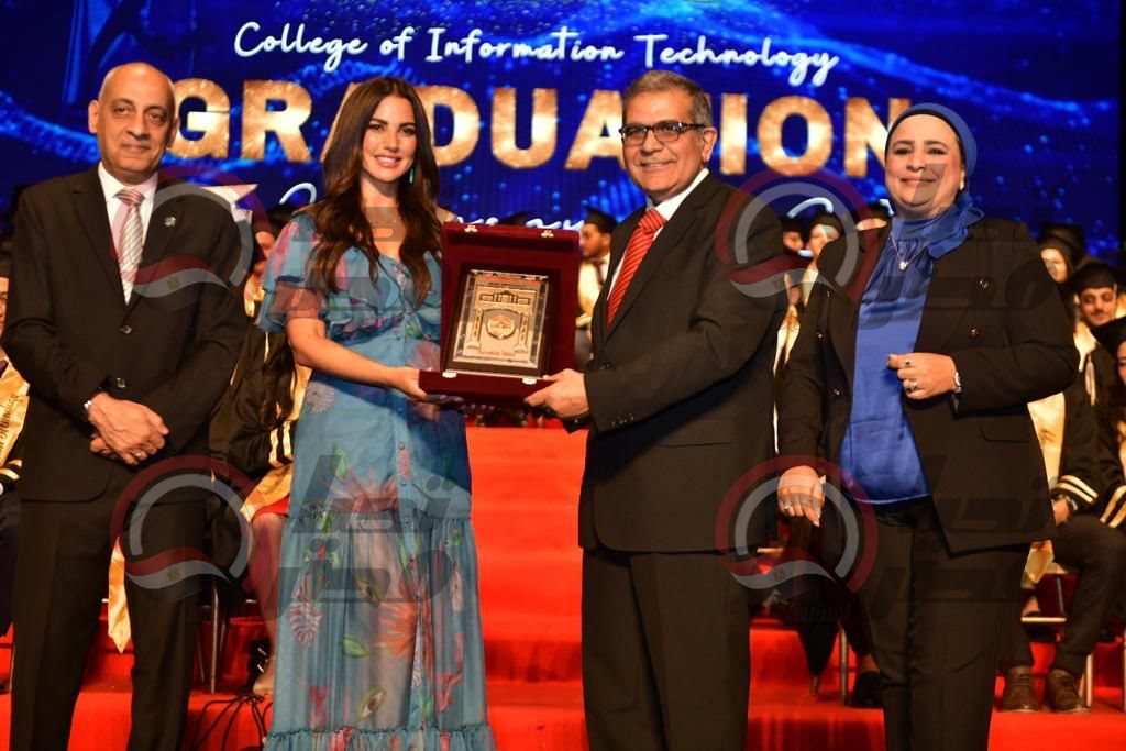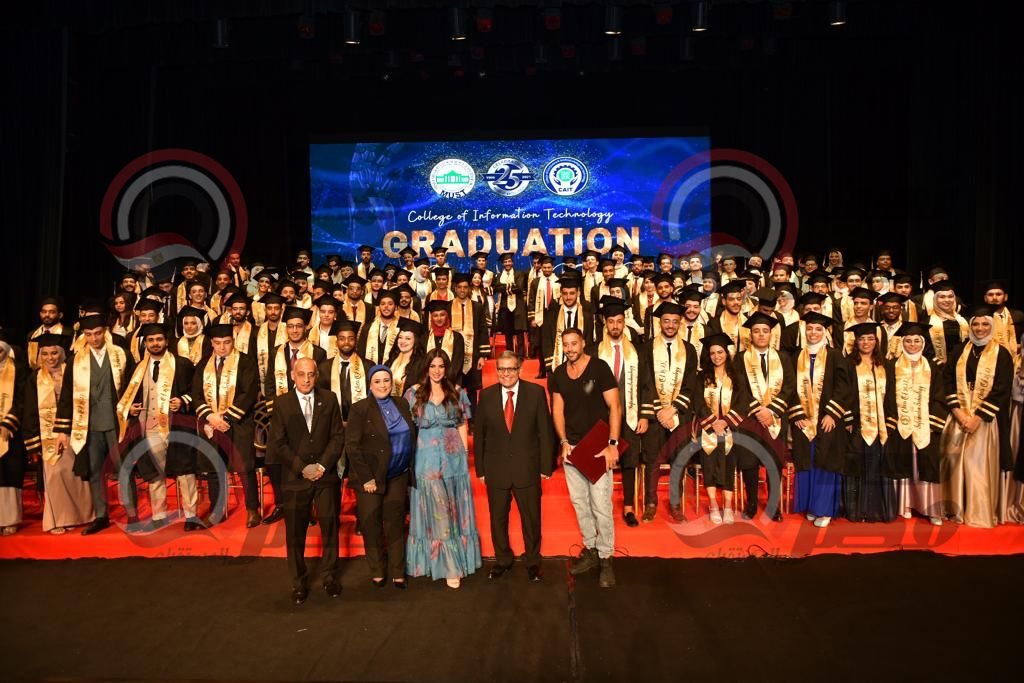 فى احتفالية ضخمة وأجواء مبهرة، احتفلت كلية تكنولوجيا المعلومات بجامعة مصر للعلوم والتكنولوجيا، بتخرج طلاب العام الدراسي 2021ـ2022، حيث أقيم الحفل برعاية خالد الطوخى رئيس مجلس أمناء جامعة مصر للعلوم والتكنولوجيا، وبحضور الدكتور أشرف حيدر غالب القائم بأعمال رئيس جامعة مصر للعلوم والتكنولوجيا، والدكتور شريف رفعت نائب رئيس الجامعة لشئون خدمة المجتمع وتنميةالبيئة، والدكتورة رانيا الجوهري عميد الكلية، والدكتورة هبة صالح رئيس معهد تكنولوجيا الملعومات، والدكتور هشام فاروق مساعد وزير التعليم العالي والبحث العلمي للتحول الرقمي، والصيني maben الرئيس التنفيذي للعلاقات العامة بشركة هواوي، والمهندسة مروة عباس المدير التنفيذي والاقليمي لشركة مصر IBM، والمهندس محمد مجدي العربي رئيس مجموعة البحوث والتطوير مجموعة العربي، والمهندس احمد فاروق المدير التنفيذي الإقليمي لشركة سيسكو، والمهندسة ريهام هشام مدير تطوير الألعمال بوزارة الإتصالات، والمهندسة أماني شوشة المسئول التقني لشركة Pro-AI ورئيس قسم اختبارات البرمجيات بوزارة الاتصالات، والمهندس عمرو زايد المدير التنفيذي لاكاديمية هواوي والمهندس اسماء سراج رئيس قطاع التدريب باكاديمية هواوي، إضافة إلى الفنانة درة، والفنان أحمد السعدني.