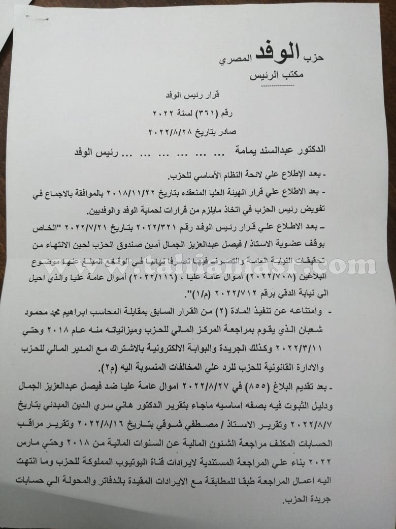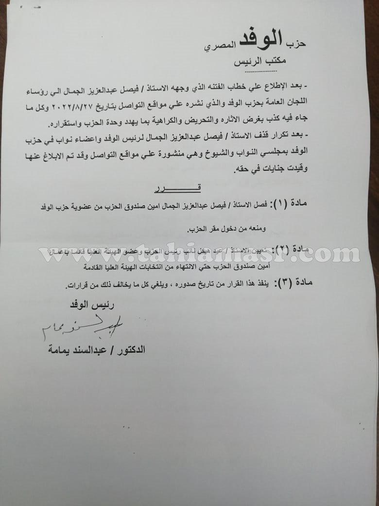 قرر عبد السند يمامة رئيس حزب الوفد فصل ا فيصل عبد العزيز الجمال أمين صندوق الحزب من عضوية حزب الوفد ومن جميع تشكيلاته ومنعه من دخول مقر الحزب.