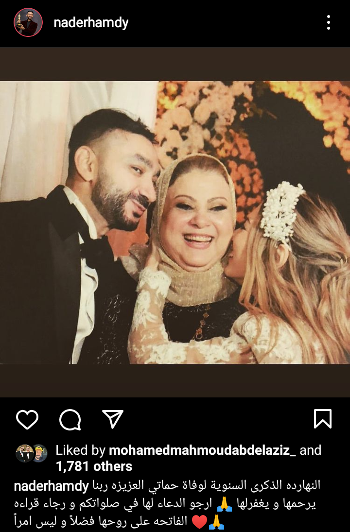 نشر الفنان نادر حمدى عبر حسابه الشخصي على موقع تبادل الصور والفيديوهات إنستجرام،صورة تجمعه ب حماته وزوجته وعلقًا قائلا “النهاردة الذكرى السنوية لوفاة حماتى العزيزة ربنا يرحمها ويغفر لها أرجو الدعاء لها فى صلواتكم ورجاء قراءة الفاتحة على روحها فضلًا وليس أمراً”، لتنهال عليه التعليقات من متابعيه من الجمهور والوسط الفني، بالدعاء.