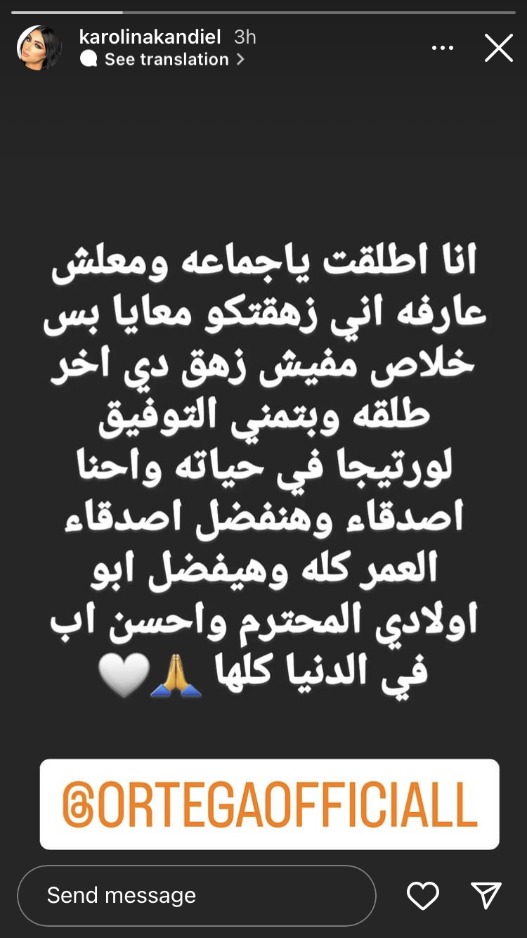 وكتبت كارولينا قنديل زوجة أورتيجا عير خاصية ستوري: أنا اتطلقت يا جماعة ومعلش عارفة إنى زهقتكوا معايا بس خلاص مفيش زهق دي آخر طلقة.
