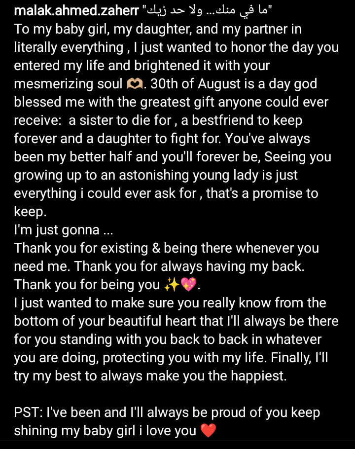 وتابعت ملك أحمد زاهر حديثها: «30 أغسطس هو يوم باركني الله بأعظم هدية يمكن أن يتلقاها أي شخص على الإطلاق: أخت تموت من أجلها، وصديقة أفضل للاحتفاظ بها إلى الأبد وابنة للقتال من أجلها. لقد كنت دائمًا نصفي الأفضل وستظل كذلك إلى الأبد، رؤيتك تكبر لسيدة شابة مذهلة هو كل ما يمكنني أن أطلبه، هذا وعد بالوفاء به.. أنا فقط سأفعل.... شكرا لك على وجودك».