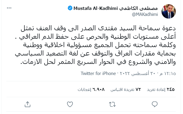 وتعقيبا على عودة الهدوء فى الشارع العراقى بعد كلمة الصدر قال رئيس الوزراء العراقى مصطفى الكاظمى فى تغريدة له على تويتر إن:" دعوة زعيم التيار الصدري إلى وقف العنف، تمثل أعلى مستويات الوطنية والحرص على حفظ الدم العراقى".