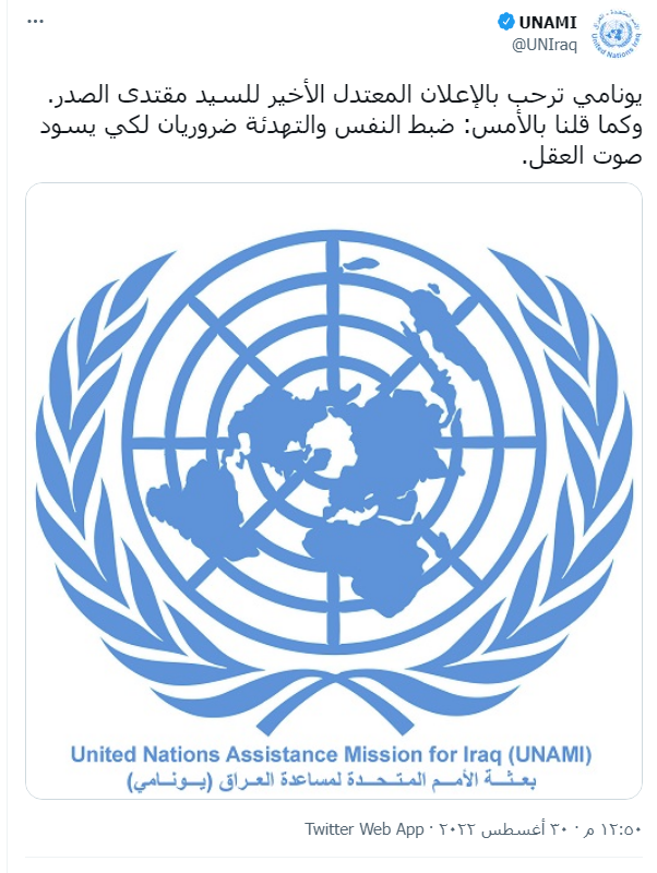وقالت البعثة الأممية لمساعدة العراق "يونامي" فى تغريدة لها عبر حسابها الرسمى على تويتر أنها ترحب بالاعلان المعتدل لزعيم التيار الصدري، مقتدى الصدر دعوته لأنصاره بالانسحاب.