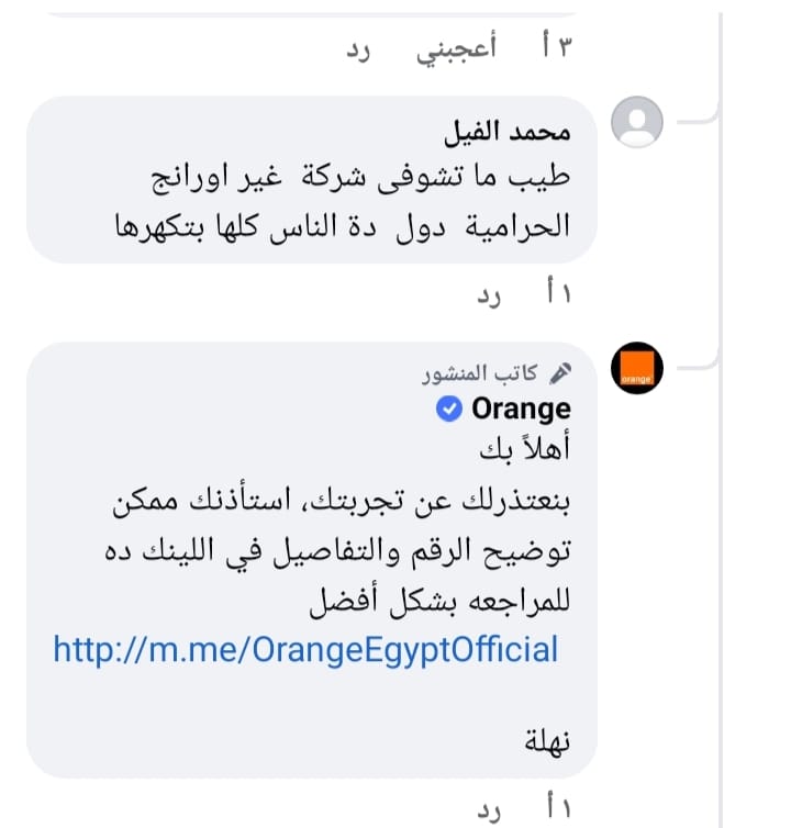 علق عميل اورنج عبر صفحة الشركة على موقع "فيسبوك"، قائلاً: "طيب ما تشوفى شركة غير اورنج الحرامية دول.. الناس كلها بتكهرها".