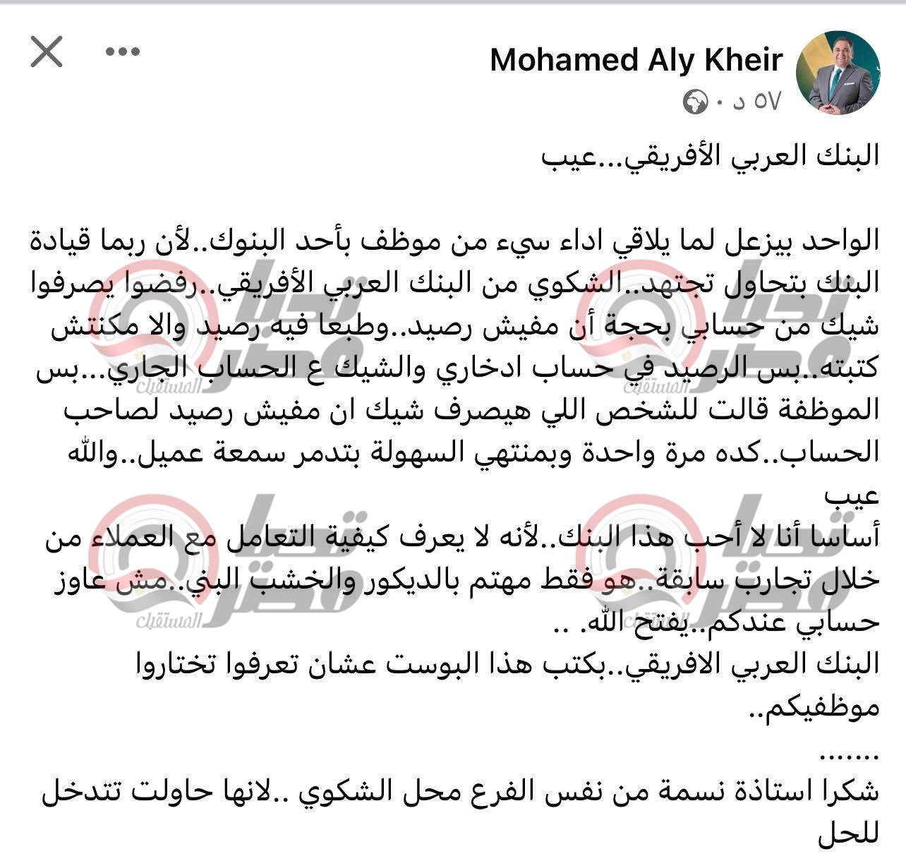 وكتب محمد علي خير، في انتقاده البنك العربى الأفريقى، على صفحته على موقع التوتصل الاجتماعي «فيس بوك»، الواحد بيزعل لما يلاقي أداء سيئ من موظف بأحد البنوك.. لأن ربما قيادة البنك بتحاول تجتهد.. الشكوى من البنك العربي الأفريقي.. رفضوا يصرفوا شيك من حسابي بحجة أن مفيش رصيد».