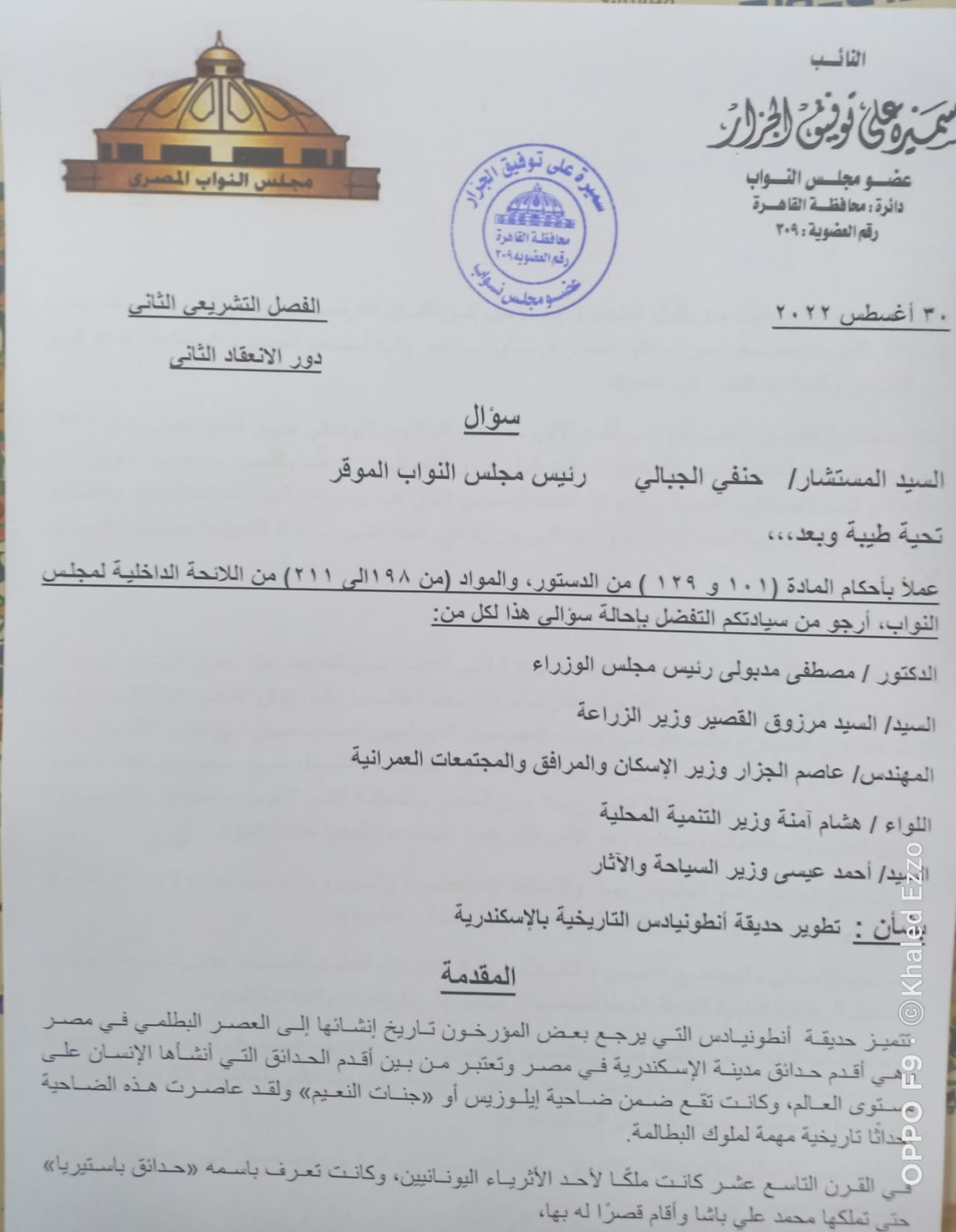 تقدمت النائبة سميرة الجزار، عضو مجلس النواب، بسؤال إلى المستشار الدكتور حنفي جبالي، رئيس مجلس النواب، موجه إلى الدكتور مصطفى مدبولى رئيس مجلس الوزراء، والسيد القصير وزير الزراعة، والمهندس عاصم الجزار وزير الإسكان والمرافق والمجتمعات العمرانية، واللواء هشام آمنة وزير التنمية المحلية، وأحمد عيسى وزير السياحة والآثار،بشأن تطوير حديقة أنطونيادس التاريخية بالإسكندرية .