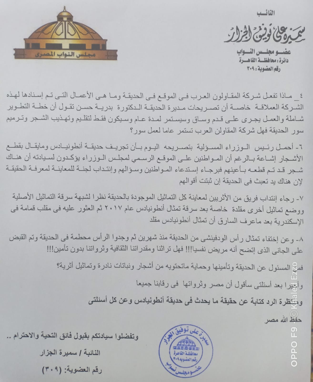 النائبة سميرة الجزار تتقدم بسؤال برلماني حول حقيقة هدم وتجريف حديقة «انطونيادس» بالاسكندرية