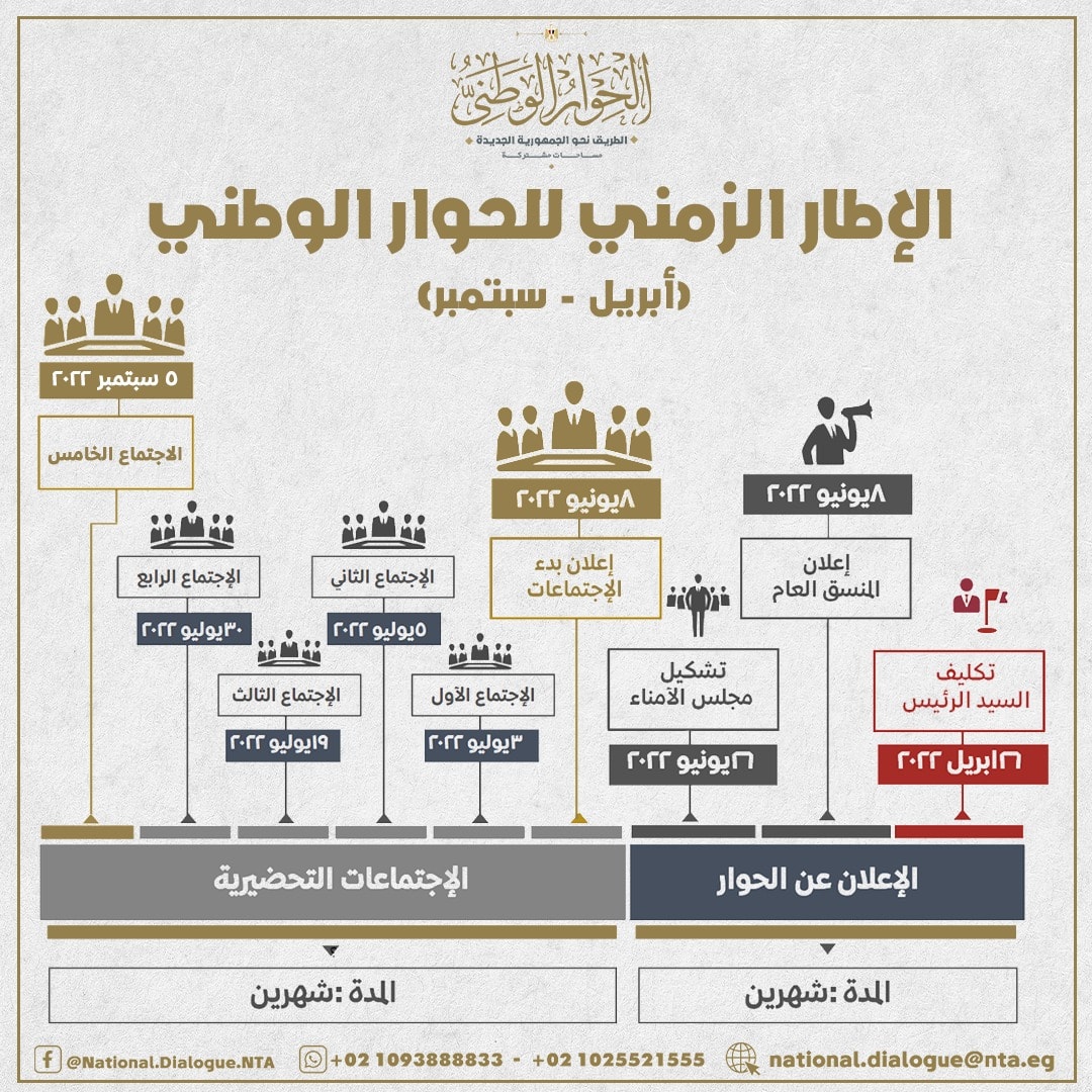 وتضمن الأنفو تكليف الرئيس السيسى بالحوار الوطنى فى 26 إبريل 2022، وفى 8يونيو 2022 تم إعلان المنسق العام، فيما تم تشكيل مجلس الأمناء 26يونيو 2022 حيث أن هذه الإجراءات تمت خلال شهرين، فيما تم الإعلان فى 8يونيو 2022 عن بدء الإجتماعات التحضيرية حيث الإجتماع الأول فى 3يوليو 2022 والإجتماع الثانى فى 5يوليو 2022 والإجتماع الثالث فى 19يوليو 2022 والإجتماع الرابع فى 30يوليو 2022 فيما الإجتماع الخامس وهو المنتظر فى 5سبتمبر 2022.