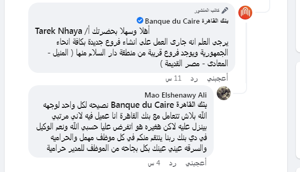 وقال عميل بنك القاهرة في تعليق على صفحة المصرف الرسمية على موقع "فيسبوك"، : "نصيحة لكل واحد لوجه الله بلاش تتعامل مع بنك القاهرة أنا عميل فيه لاني مرتبي بينزل عليه لكن هغيره".