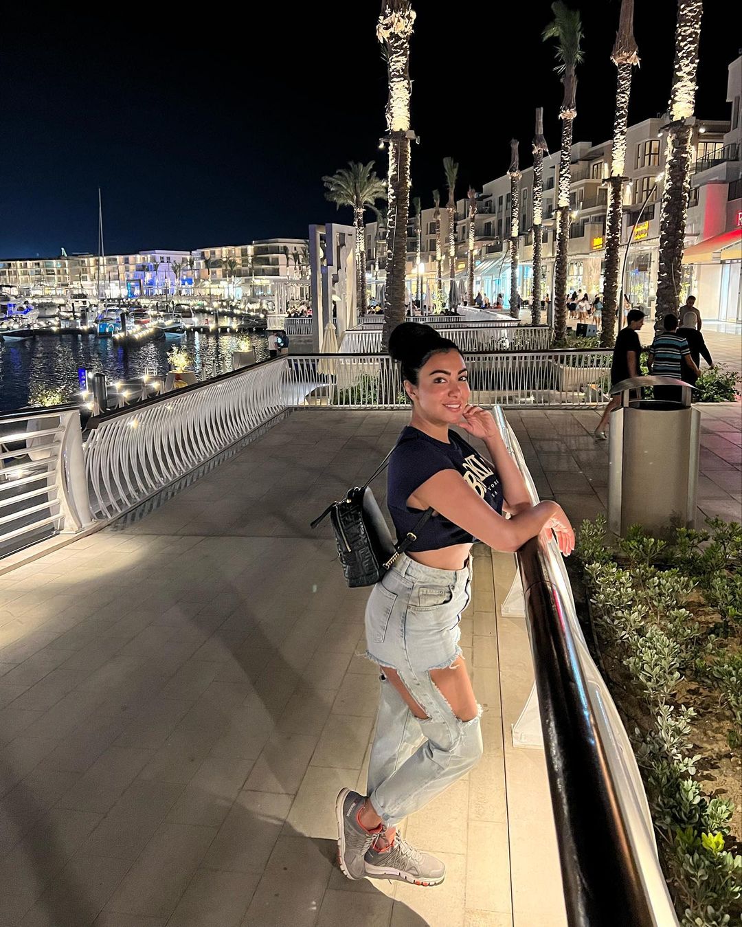 ظهرت ميرهان حسين خلال مجموعة الصور التي شاركتها على السوشيال ميديا، بتوب أسود قصير كشف عن بطنها، وارتدت عليه بنطلون cutting، كشف عن جزء كبير من فخذها، وعن تسريحة شعرها فتعمدت رفعها لأعلى حتى تناسب إطلالته المسائية، كما ارتدت حقيبة ظهر سوداء، لتظهر ميرهان حسين بكامل أناقتها.